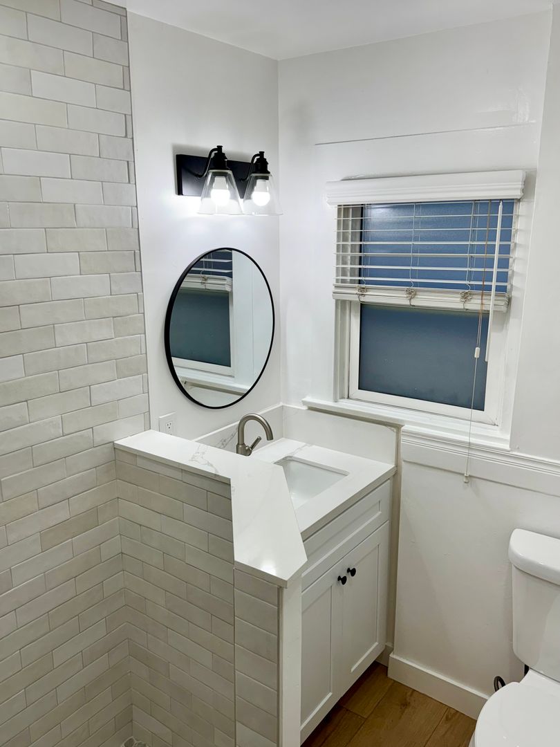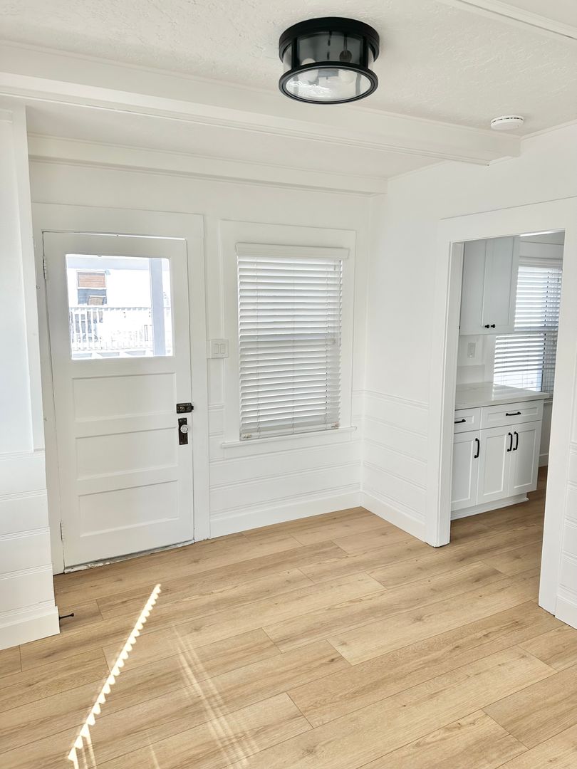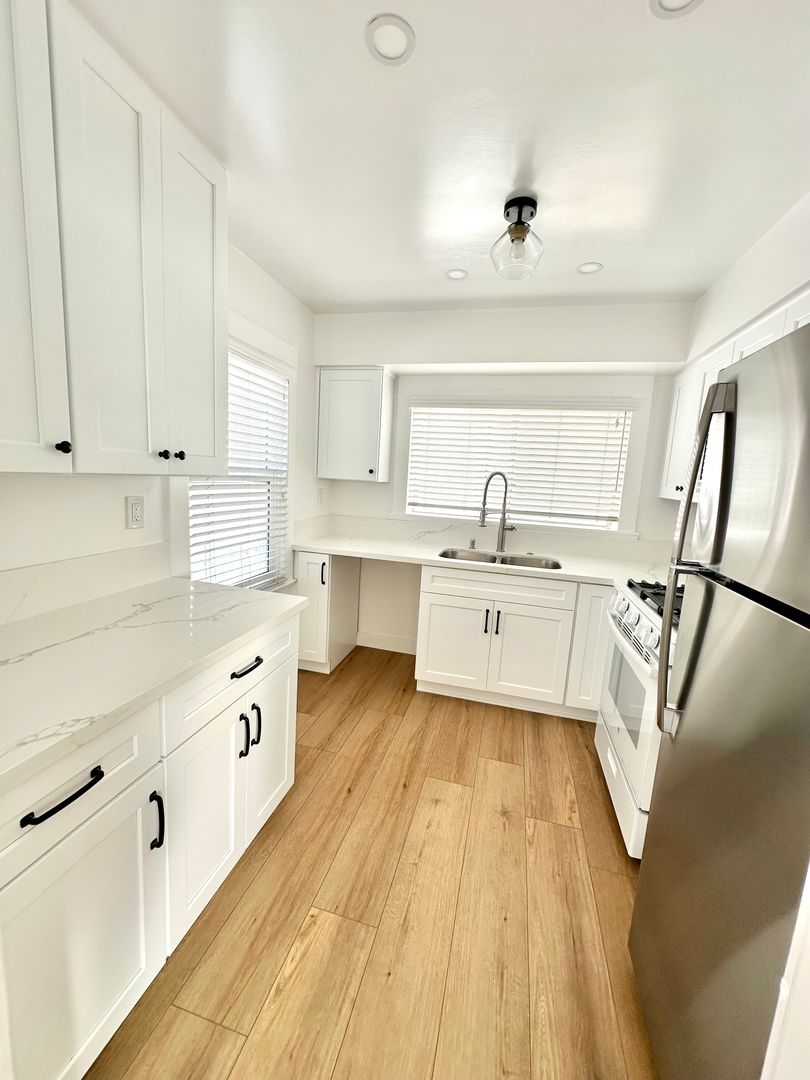 Nestled just three doors from The Strand in one of South Hermosa Beach’s most coveted pockets, 31 6th Ct. is a fully remodeled upper unit with its own private entrance and no shared walls. Exposed wood beams and warm wood siding lend authentic beach-house character, while abundant windows flood the space with natural light. A brand-new gourmet kitchen boasts custom cabinetry, quartz countertops, sleek faucet, stainless-steel refrigerator, built-in microwave, and dishwasher, all illuminated by modern recessed lighting. The bathroom features custom designer tile, a frameless glass shower enclosure, Delta stainless fixtures, a new vanity, new toilet, and a quiet ceiling fan. White-oak vinyl plank flooring flows throughout, complemented by a new AC split unit and two ceiling fans for year-round comfort. The open family room seamlessly connects to a dining area or dedicated home-office space—perfect for remote work—while a private patio entrance strung with café lights invites relaxed evenings. Quiet, light-filled, and move-in ready, this rare two-unit building offers the ultimate coastal retreat just steps from the sand.